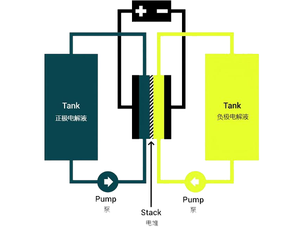 储存在正、负极电解液储罐中的电化学活性分子,在循环泵的驱动下流经电极,发生氧化 / 还原反应,接收 / 释放电子,实现电能与化学能的可逆转化